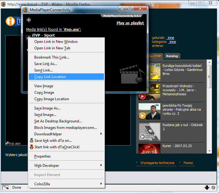 Na stronie na ktorej chcemy zripowac stream, w menu kontekstowym wybieramy: