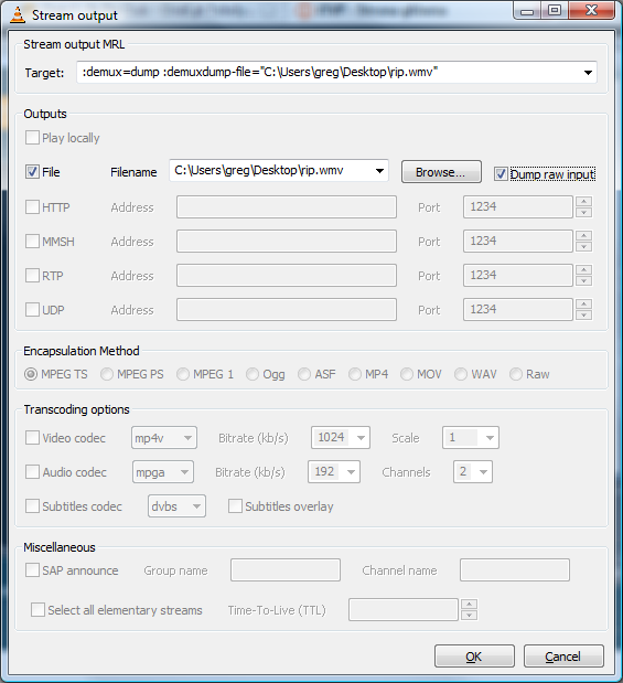 File zapodajemy lokalizacje gdzie strumien ma zostac zapisany i zaznaczamy "