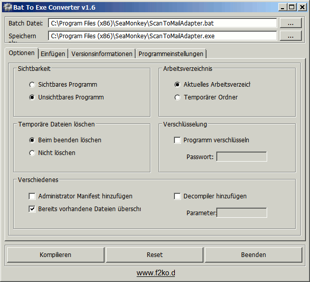 Now convert your ScanToMailAdpter.bat into ScanToMailAdpter.exe. I used the following configuration for the Converter to succeed and also avoid a nasty DOS box opening in the background together with the mail composer: